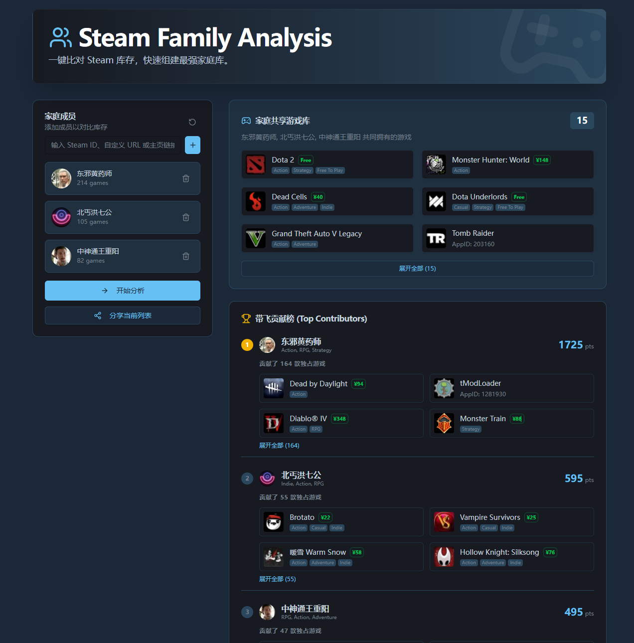 - 价值与偏好画像:集成 Steam Store API,显示游戏价格及标签,分析家庭整体游戏偏好。